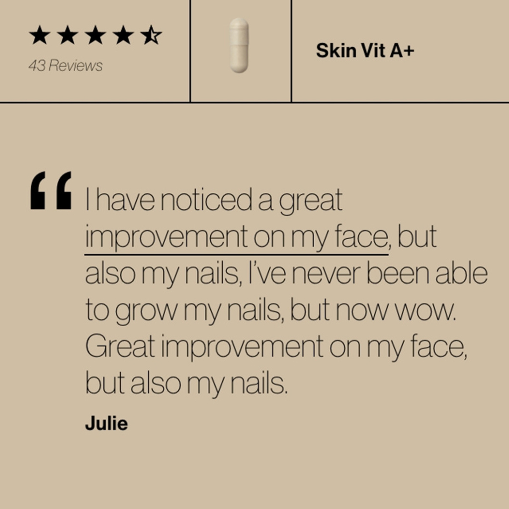 Suitable for all ages and skin types. Skin Vit A+ is an excellent introduction to supplementation and provides over-arching benefits to the skin and overall wellbeing of our bones, muscles and immune system**.